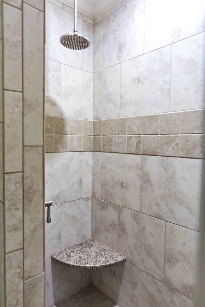 an empty and tiled gray and beige shower in a guest bathroom