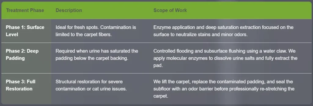 We are always transparent with our clients: for severe cat contamination, Phase 3 is the only viable path. We cannot guarantee total odor elimination with surface or padding flushes alone because the urine salts have likely reached the subfloor. To provide the best pet odor removal service near me results, we must go to the source.