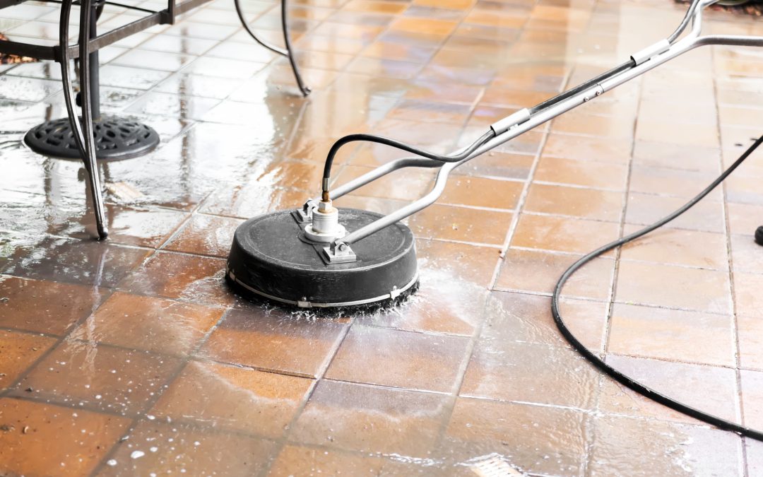 Power washing residential pool patio tiles