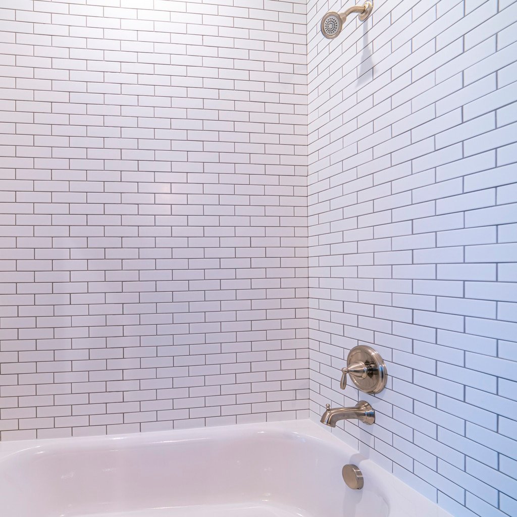 Square frame Clean white tiled shower combination tub bright interior