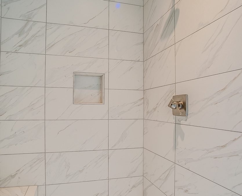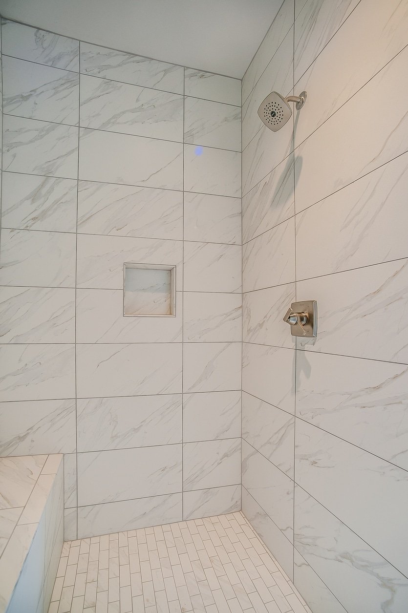 White tile shower with chrome shower head